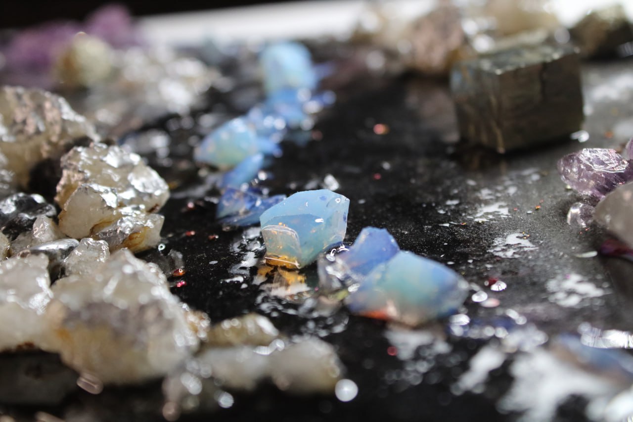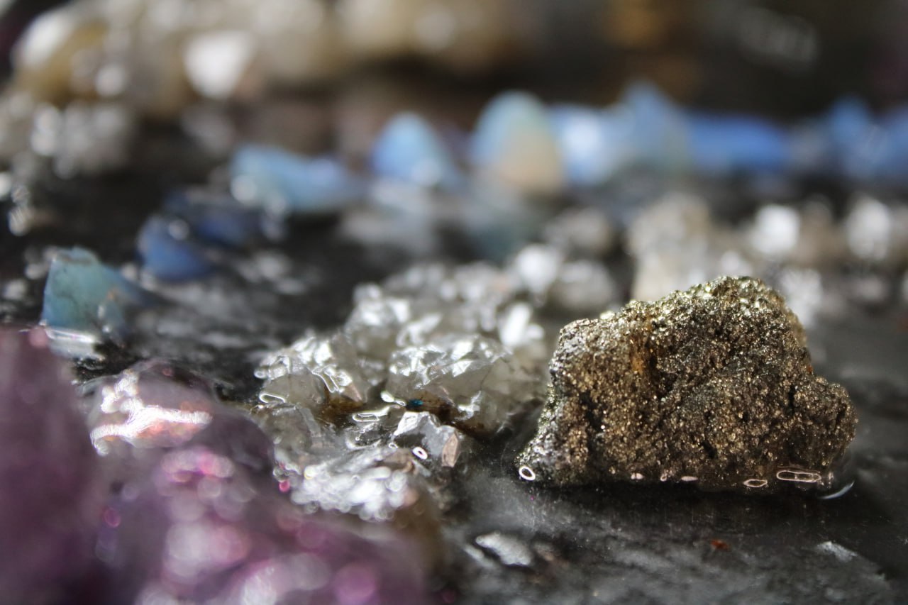 Quarze, Edelsteine, Messing, Aluminium, Kupfer, Kupferlackdraht, Germanium, Holz