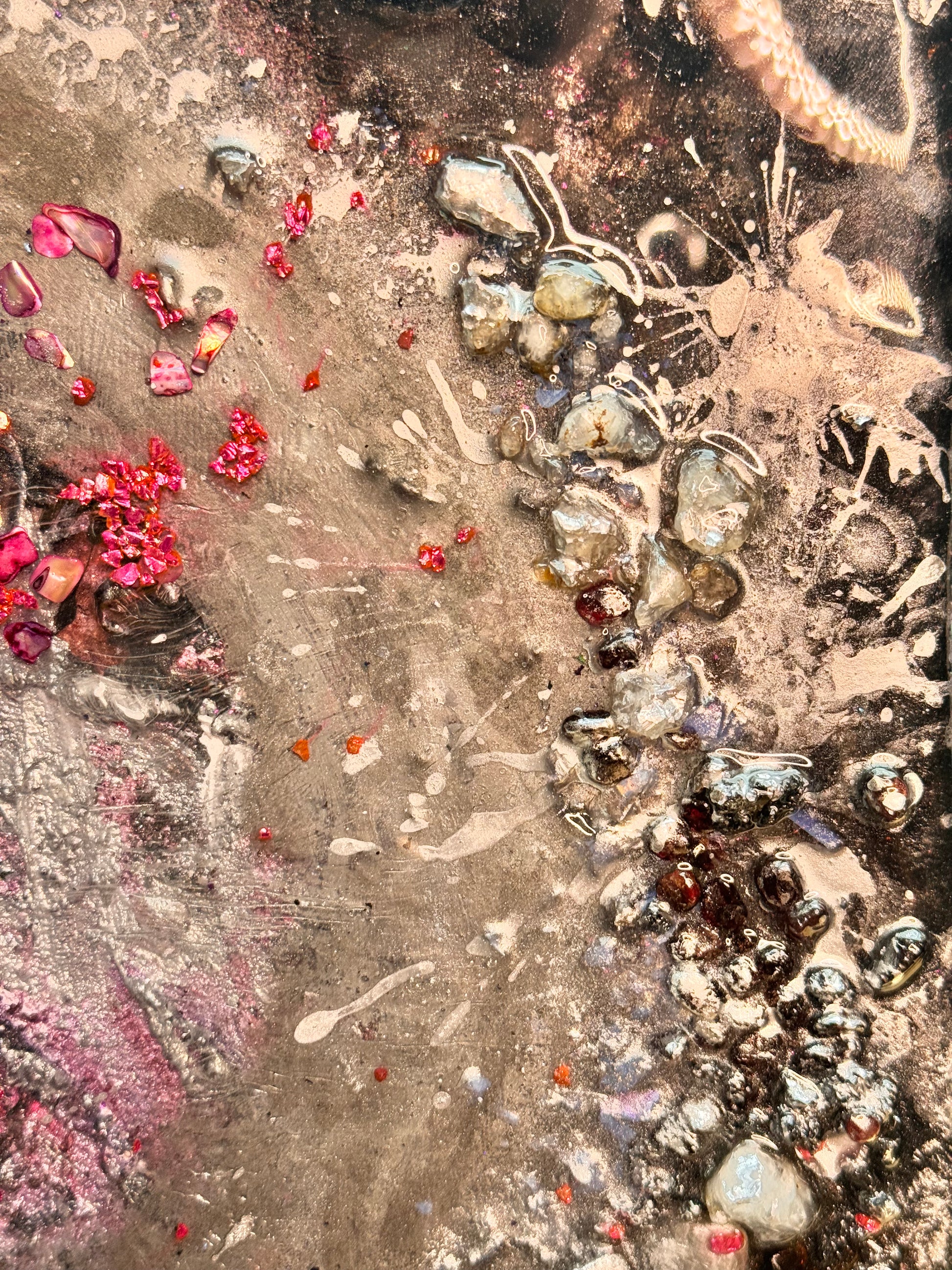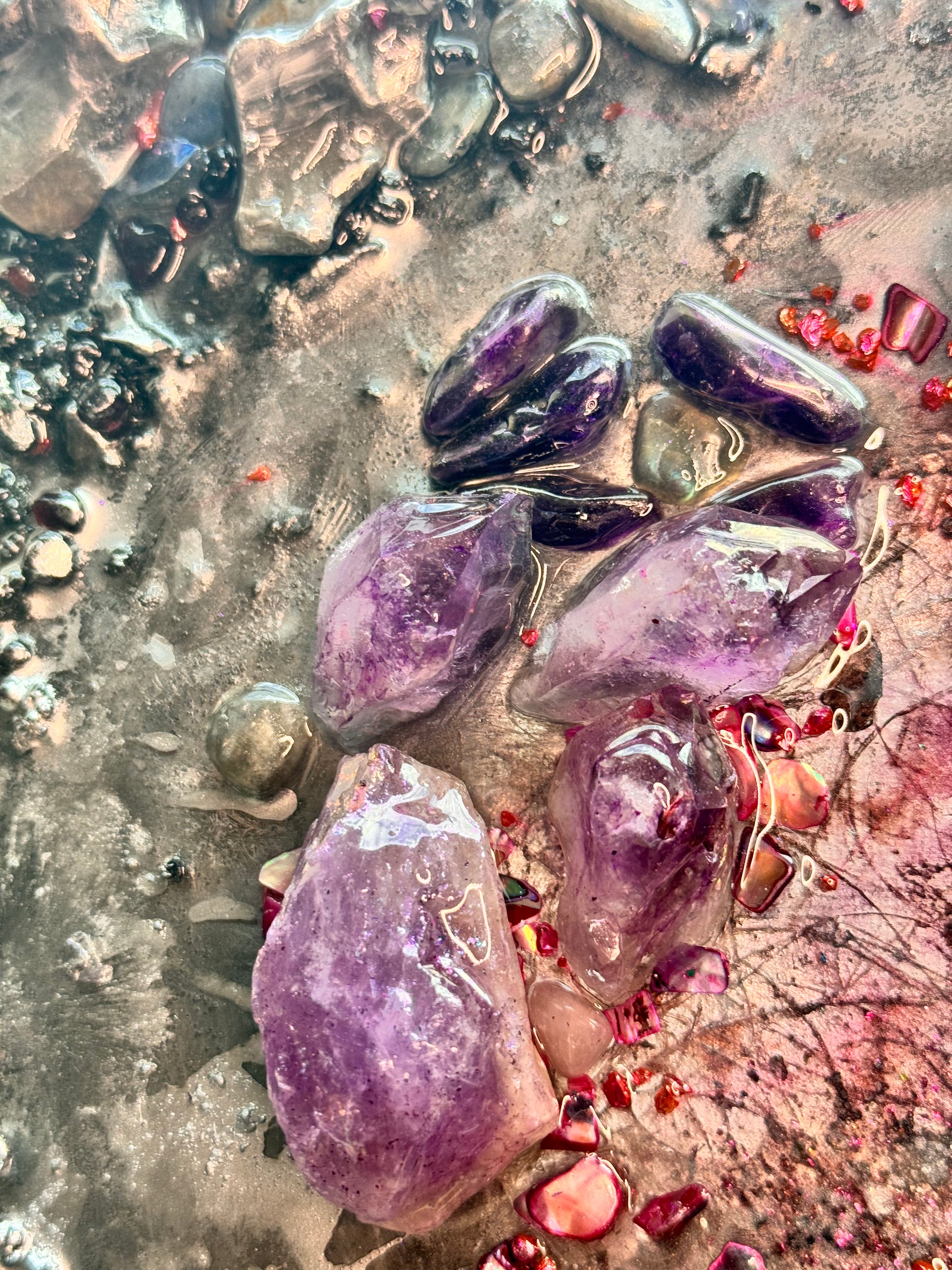 In meinem Energiebild vereinen sich die Energien von Bergkristall, Pyrit, Lava, Mondstein, Amethyst, Feuerstein und Rubin, um die Essenz von Castor und Pollux einzufangen. Jedes Element wurde sorgfältig ausgewählt, um die verschiedenen Facetten ihrer Persönlichkeit und ihres Erbes zu repräsentieren