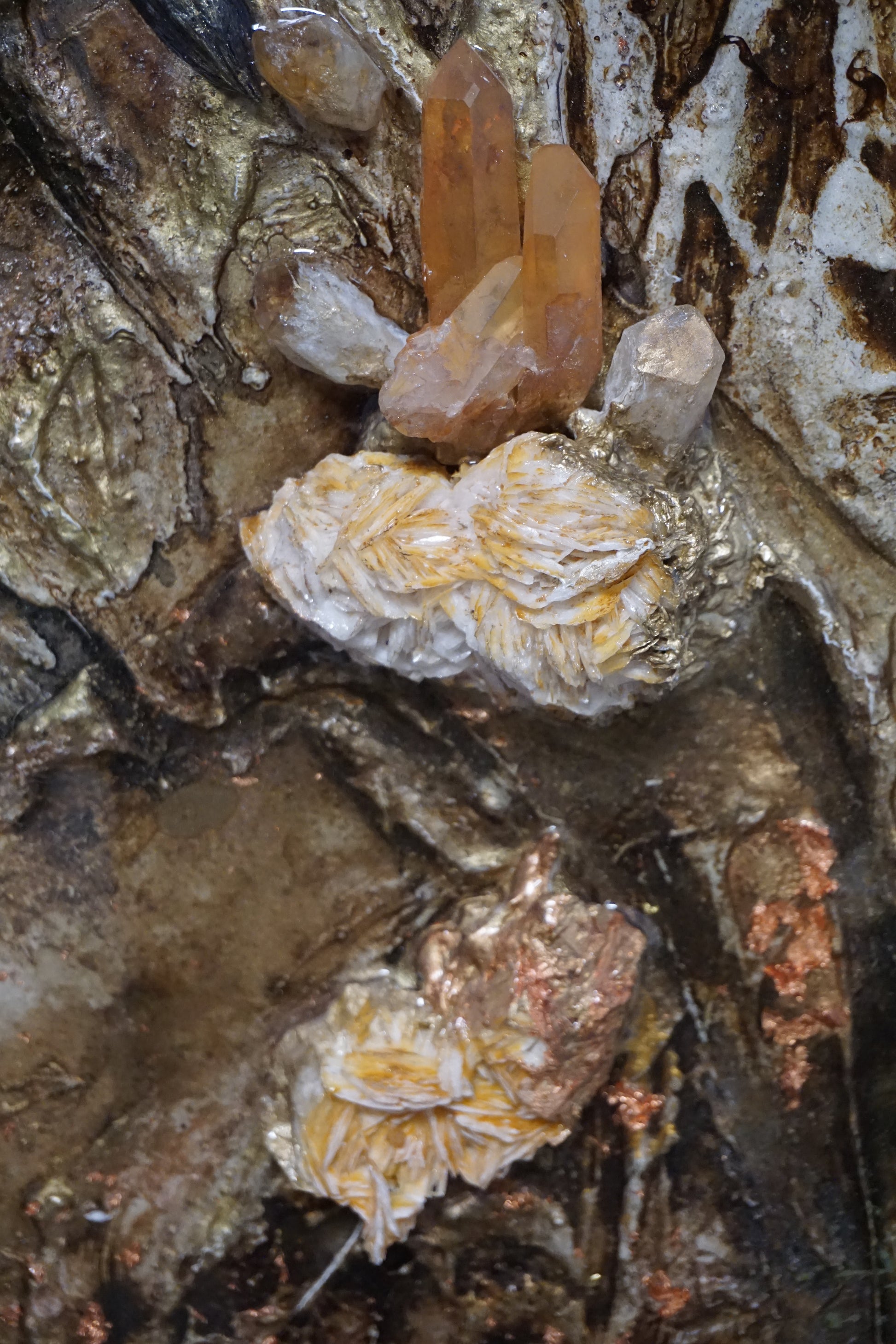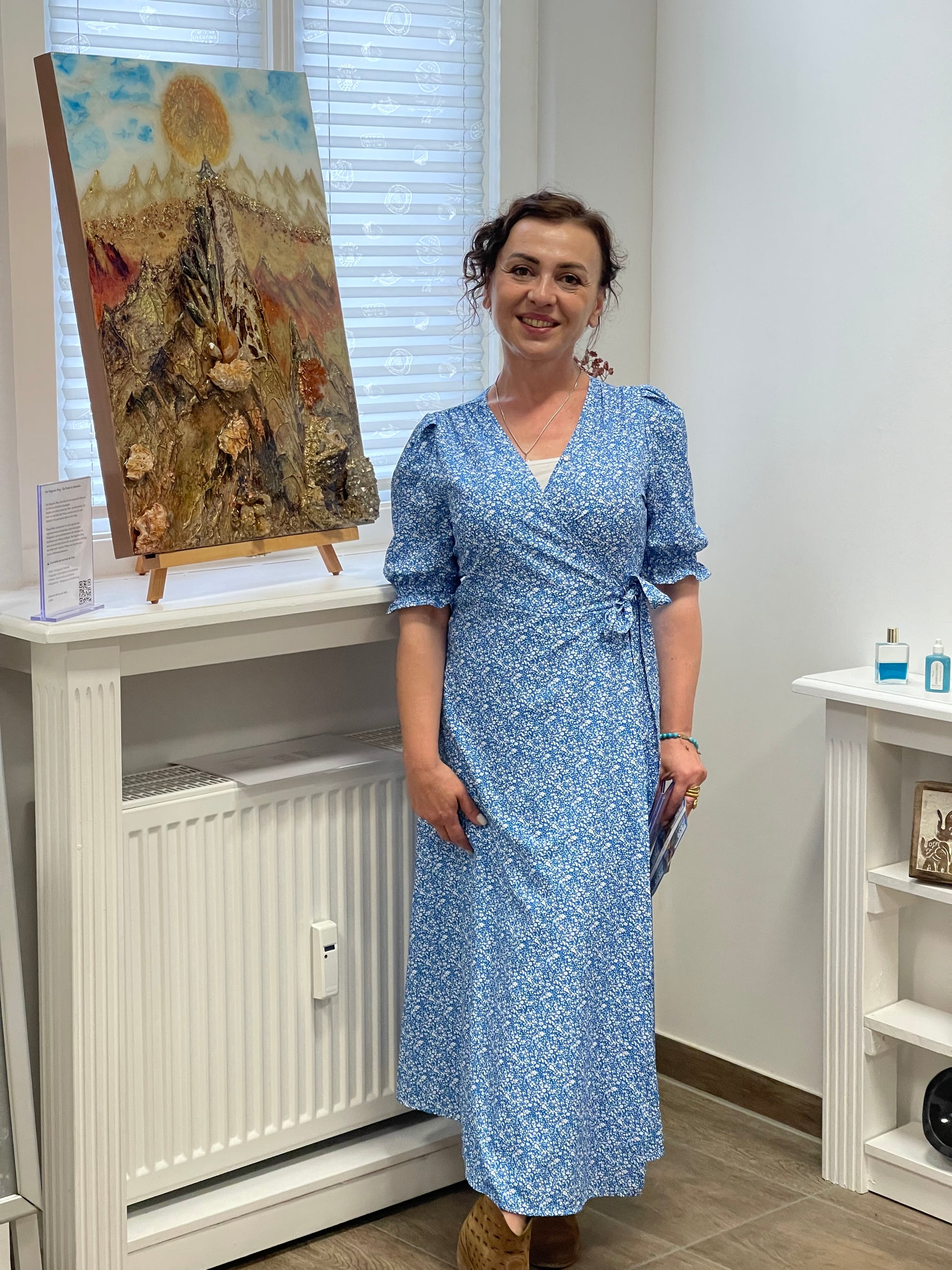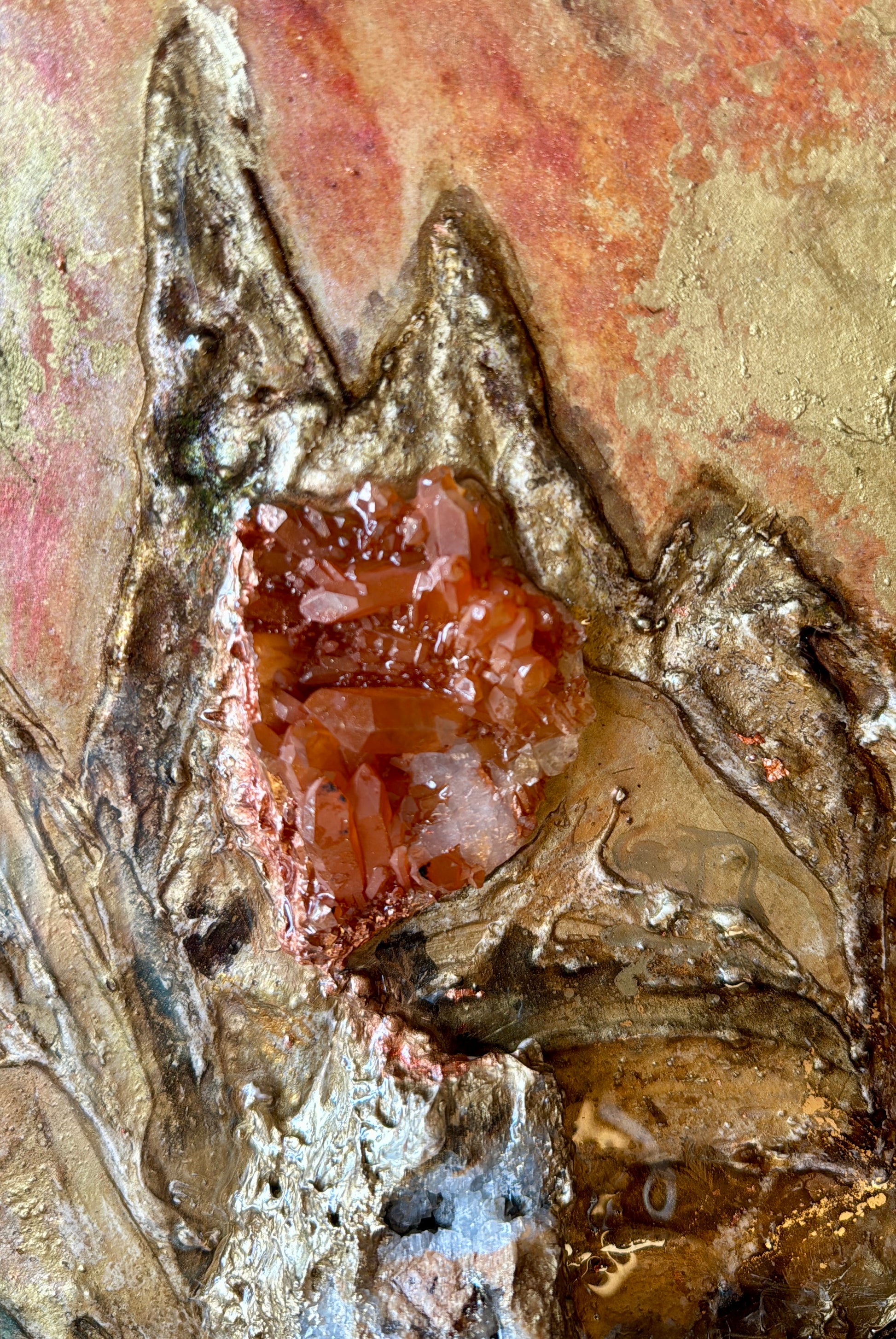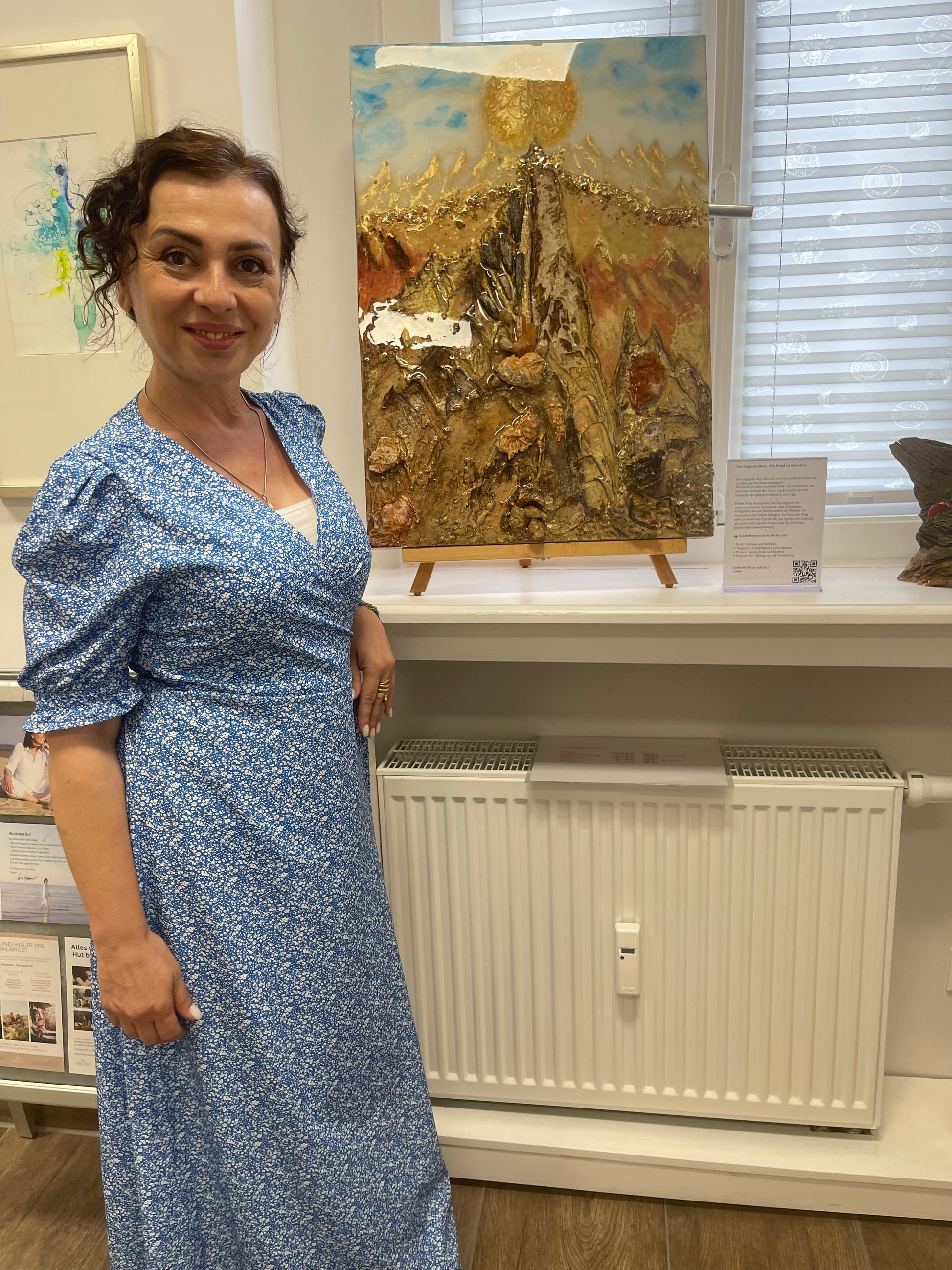 Die in den Berg eingebetteten Bergkristalle und Quarze, die aus dem Bergischen Land stammen und von mir bearbeitet wurden, verleihen dem Bild eine greifbare Dimension und laden es mit echter, spürbarer Energie auf. Diese Kristalle fungieren als Knotenpunkte von Kraft, die die spirituellen Schwingungen verstärken und dem Betrachter helfen, sich mit den höheren Ebenen des Bewusstseins zu verbinden. Jeder Kristall scheint ein Funken des verborgenen Wissens und der Weisheit von Shambala zu sein, der darauf wartet, entdeckt zu werden.