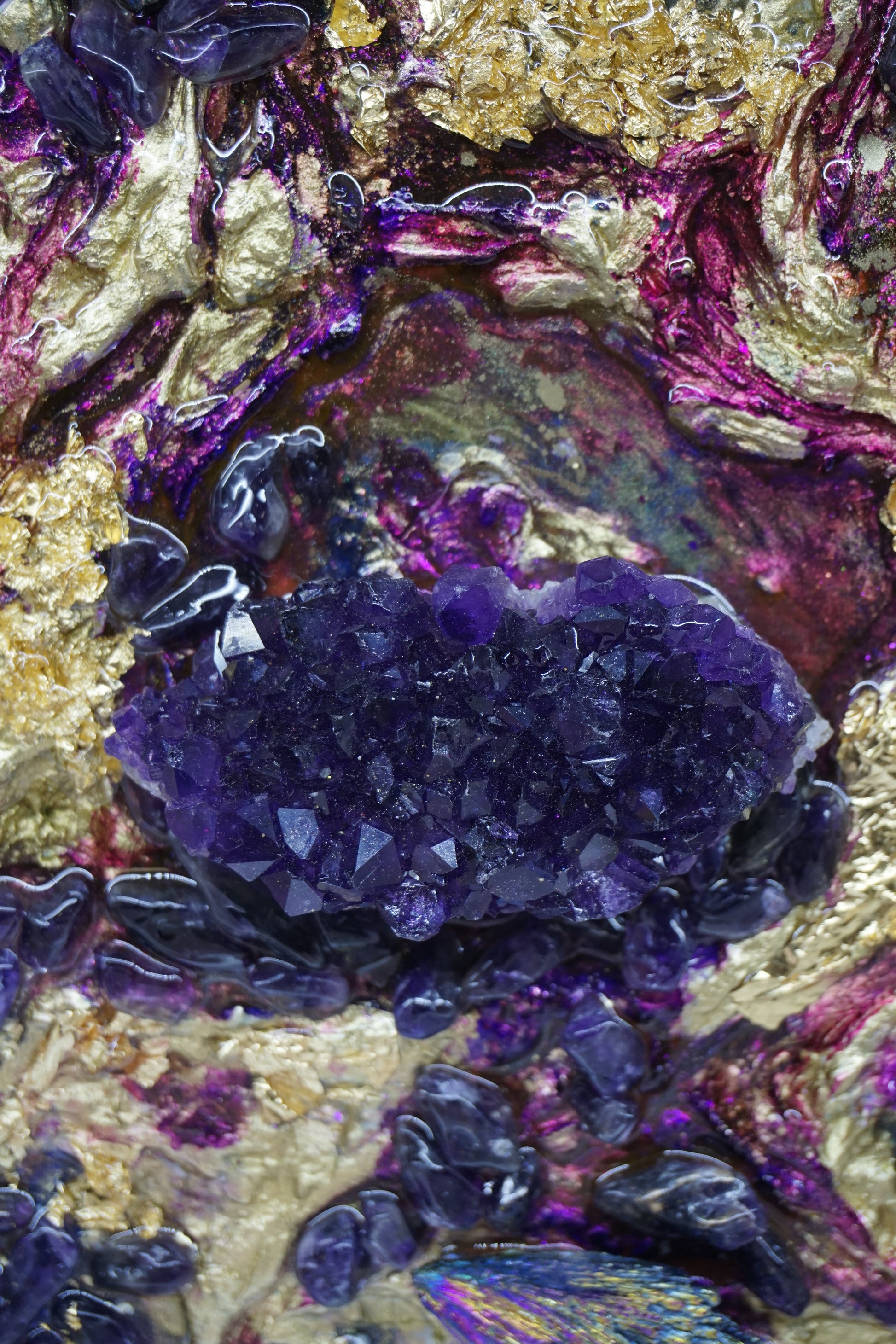 Das erste Werk, dominiert von tiefen Schwarz- und Violetttönen mit goldenen Akzenten, offenbart die mystische Kraft des Amethysts in Verbindung mit der Klarheit des Bergkristalls. Wie ein Blick in die unendlichen Weiten des Universums, lädt dieses Gemälde den Betrachter ein, über seine Existenz im kosmischen Gefüge nachzudenken. Der Amethyst, bekannt für seine spirituellen und meditativen Eigenschaften, verbindet uns mit höheren Bewusstseinsebenen, während der Bergkristall Klarheit und Reinheit symbolisiert. Gemeinsam erinnern sie an die Sternennebel und kristallinen Strukturen des Kosmos, eine Synthese aus Mystik und Klarheit.